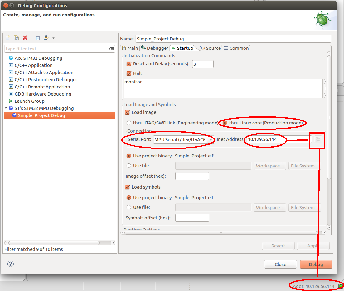Double left-click on ST’s STM32 MPU Debugging to create a new Debug Configuration. Its name (“Simple_Project Debug” in this example) and the path to the executable are provided by the project.