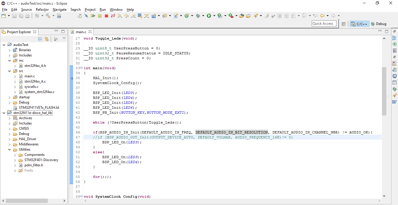 [Solved]Unable to use Audio_in/out_init, using stm32f411e-disco & sw4stm32