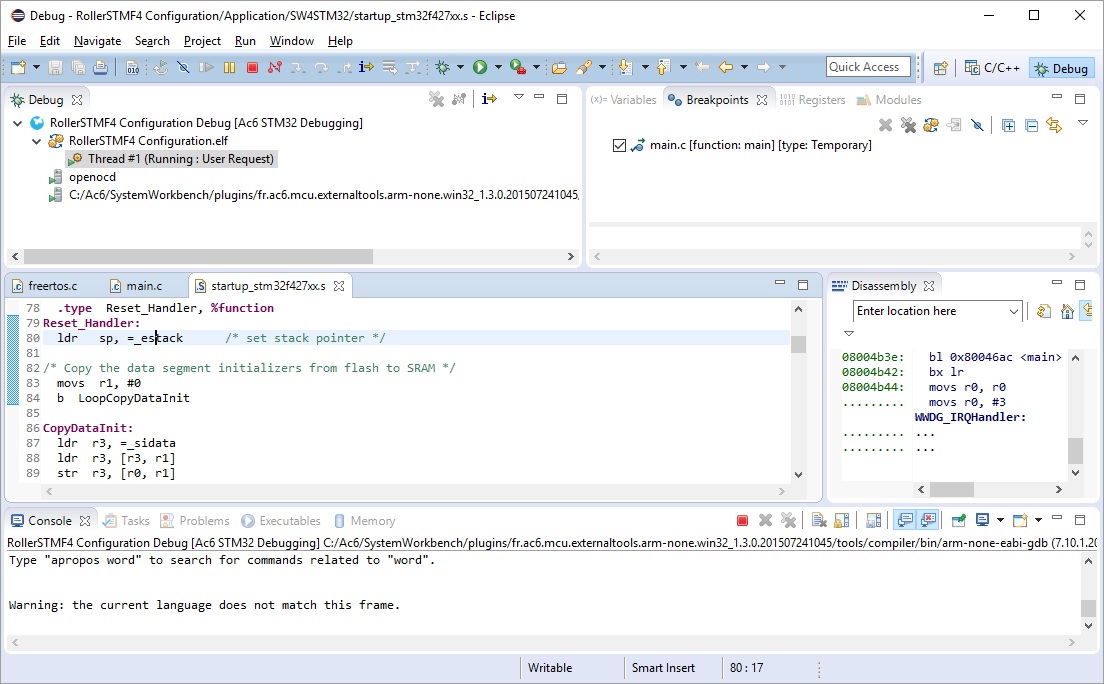 For the first time debug was successful without any problem, but after that (terminated and ran debug again) debug stays Reset_Handler forever, see attachment. Step Into/Over buttons were gray. Restarting Eclipse did not help. The project was gnerated by CubeMX with FreeRTOS and run OK (without debug) on custom STM32F427 board.
