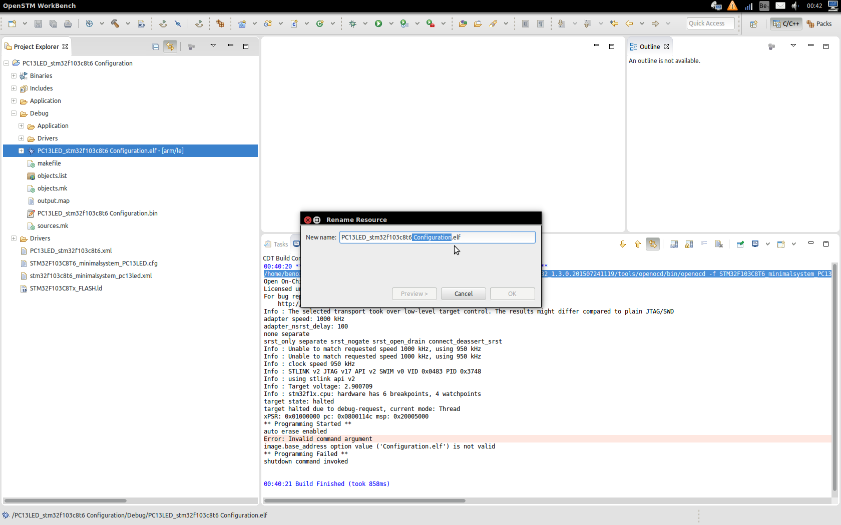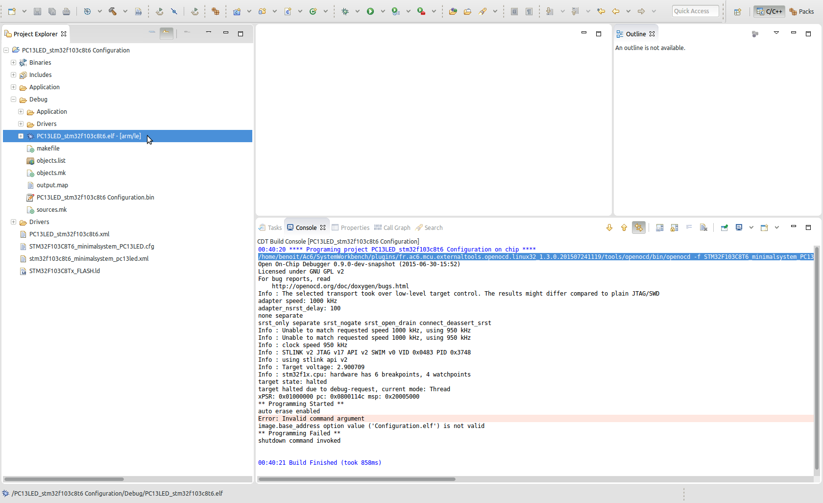PSS: The CubeMX developers could have seen it coming because eclipse generates the command line as: /home/benoit/Ac6/SystemWorkbench/plugins/fr.ac6.mcu.externaltools.openocd.linux32_1.3.0.201507241119/tools/openocd/bin/openocd -f STM32F103C8T6_minimalsystem_PC13LED.cfg -s “/home/benoit/workspaceSTM32Fxx/PC13LED_stm32f103c8t6/SW4STM32/PC13LED_stm32f103c8t6 Configuration” -s /home/benoit/Ac6/SystemWorkbench/plugins/fr.ac6.mcu.debug_1.3.0.201507241045/resources/openocd/scripts -c “program Debug/PC13LED_stm32f103c8t6 Configuration.elf verify exit” which results in ‘Configuration.elf’ being seen as a separate command argument. Say ‘thank you’ ;)