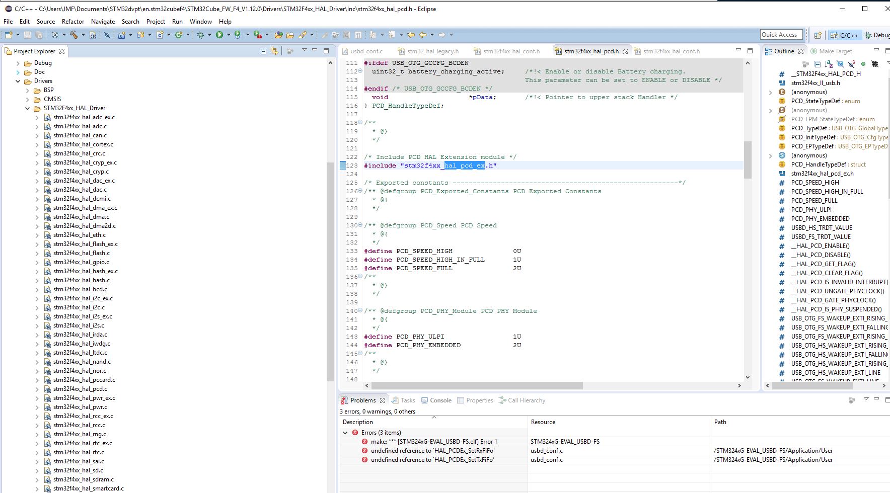 undefined reference to `HAL_PCDEx_SetRxFiFo’ usbd_conf.c /STM324xG-EVAL_USBD-FS/Application/User line 363 C/C++ Problem