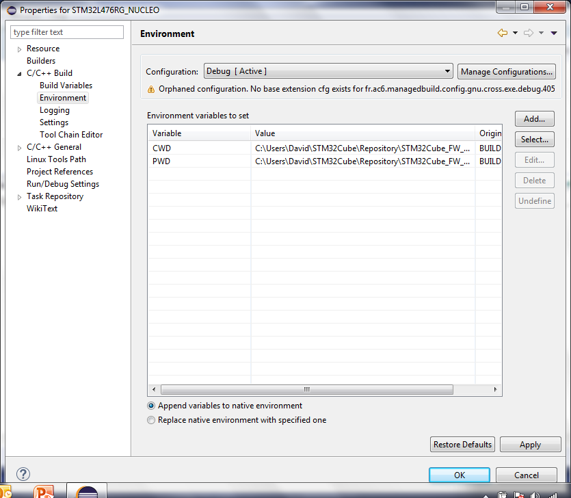 Orphaned configuration. No base extension cfg exists for fr.ac6.managedbuild.config.gnu.cross.exe.debug.405185049