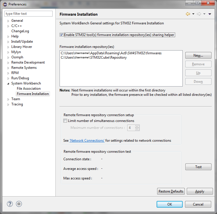 A Firmware Installation preference page has been added: (Window > Preferences > System Workbench > Firmware Installation)