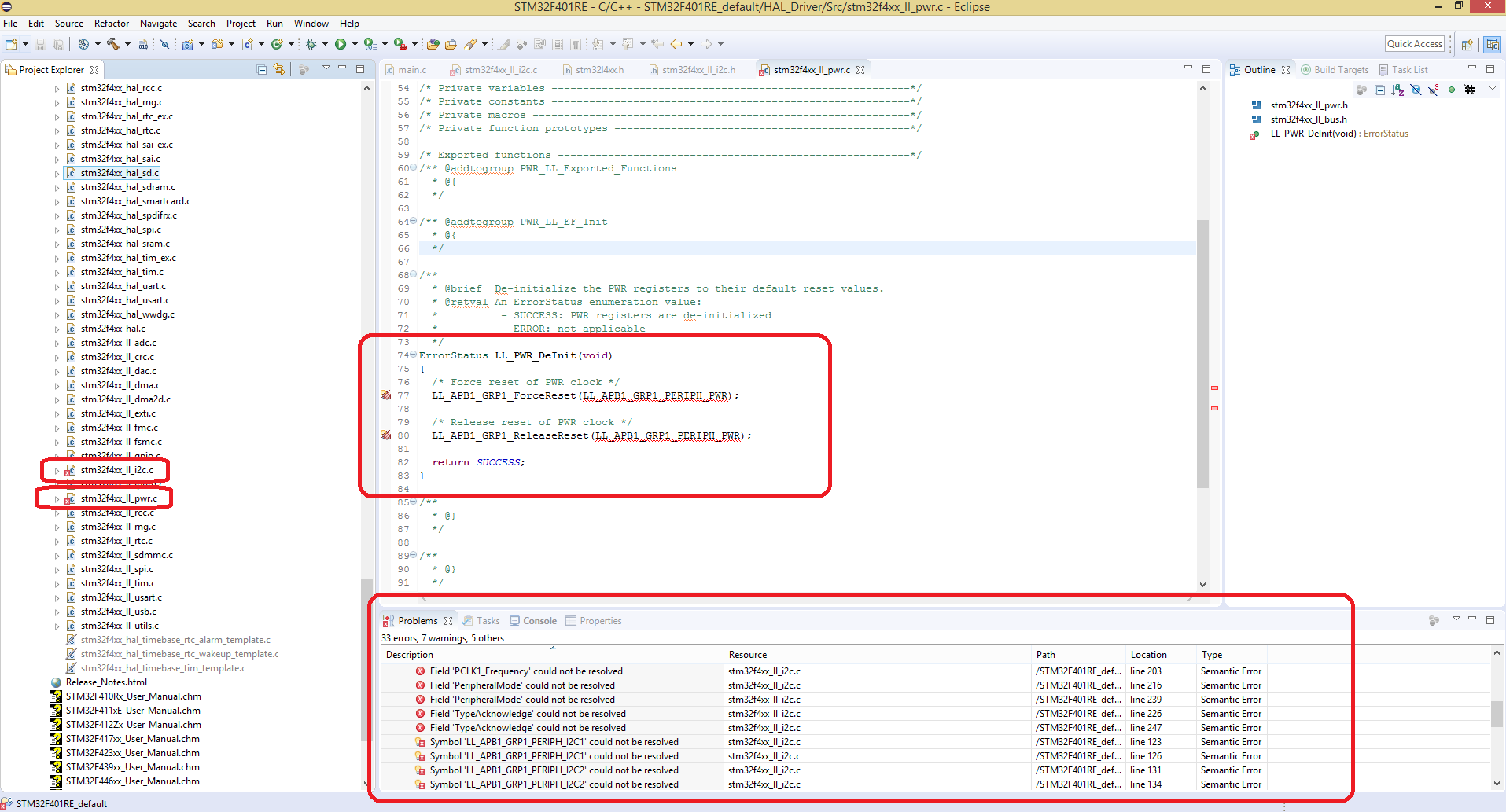1) make sure that the USE_FULL_LL_DRIVER is defined under Project->Properties->Settings->MCU GCC Compiler->Symbols “Defined symbols (-D)”