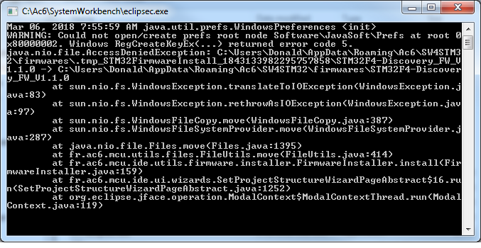 From stack trace, sounds some native java command (files move) is failing. Such is invoked by sw4stm32 but no sw4stm32 code failing here. Move process is invoked by the end of firmware setup process to pick data from temporary (working) directory to final area.