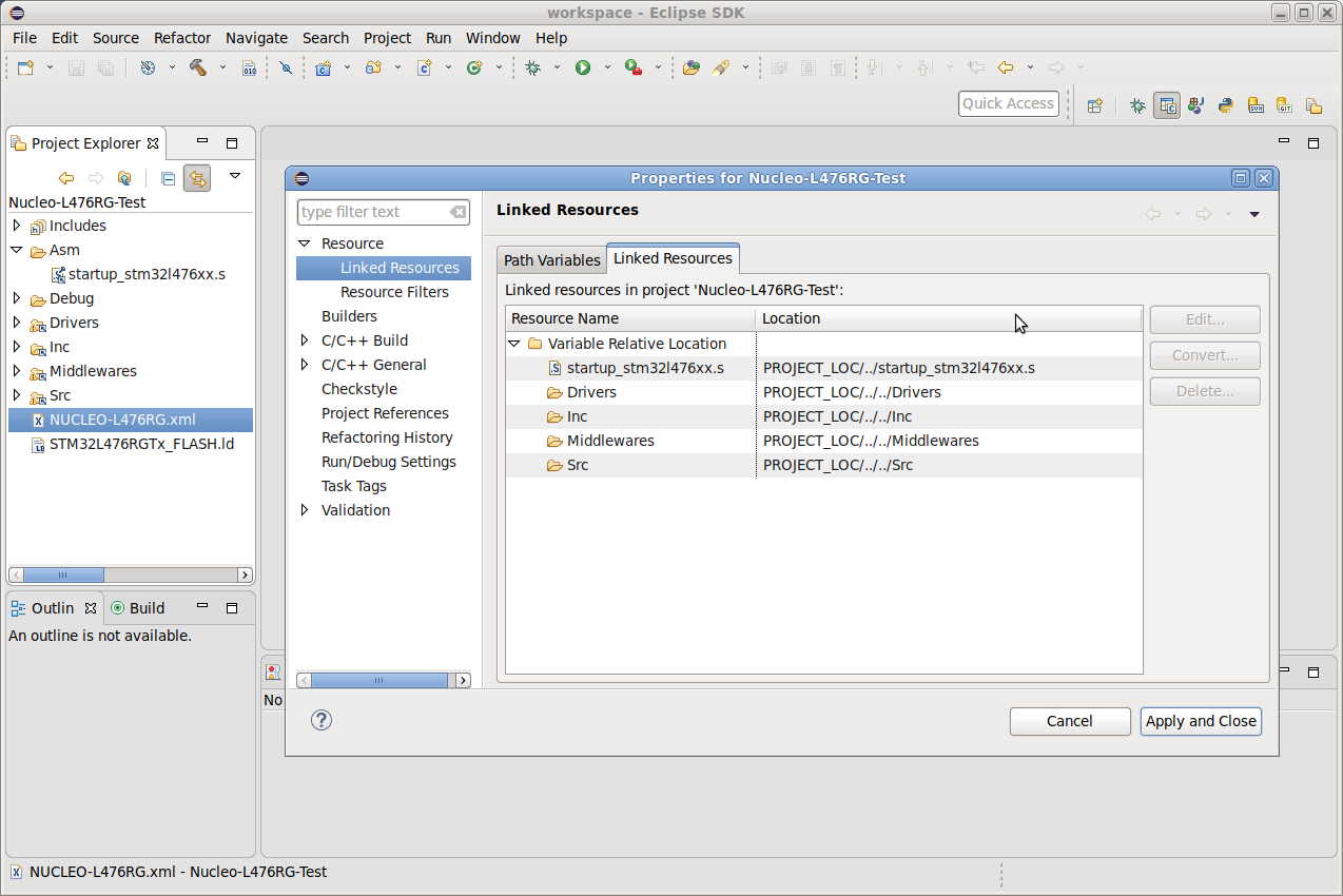 However, I couldn’t test my last claim right now, as my project seems broken since I edited some Eclipse files by hand. Also, every time I generate code, CubeMX will overwrite the .project file. It will again link every individual file.