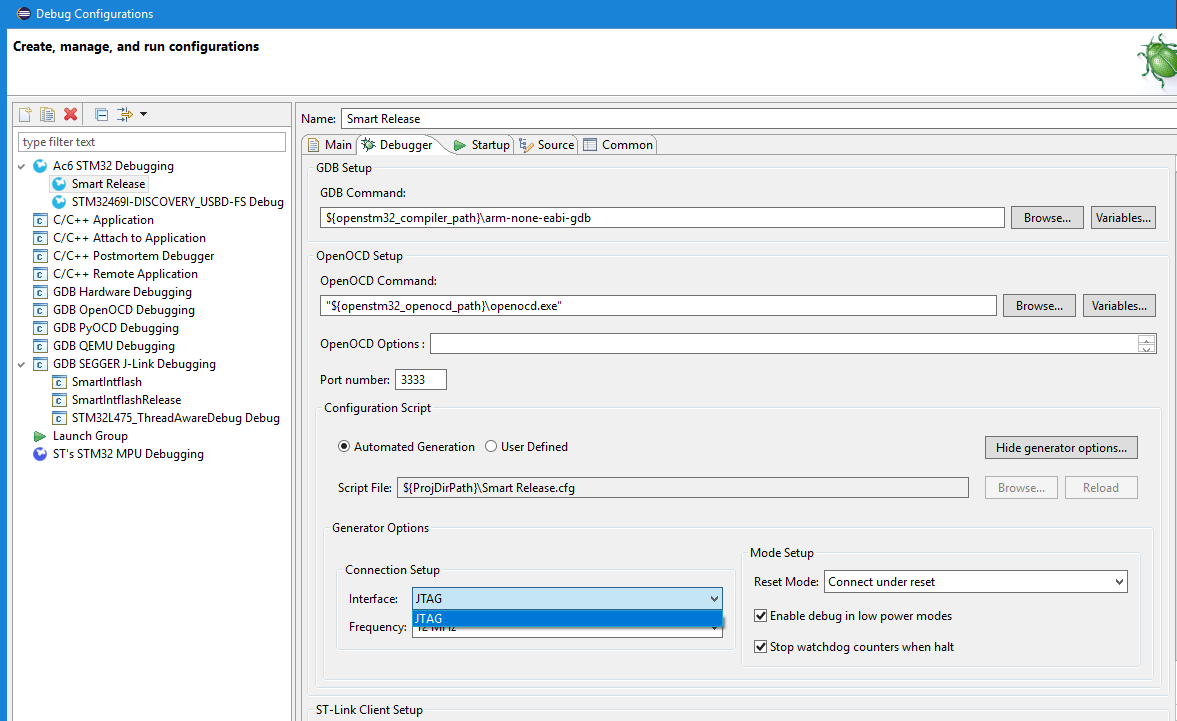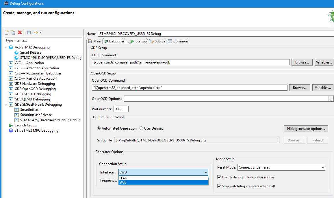 I upgrade the IDE to version 2.9 and imported the project, it is built successfully and then I tried to create a debug configuration for it. I’m using ST-LINK for my debugging and the target is connected over SWD interface but from some reason the debug configuration does not show me the SWD option under the Debugger tab - Connection Setup - Interface only JTAG is available there: