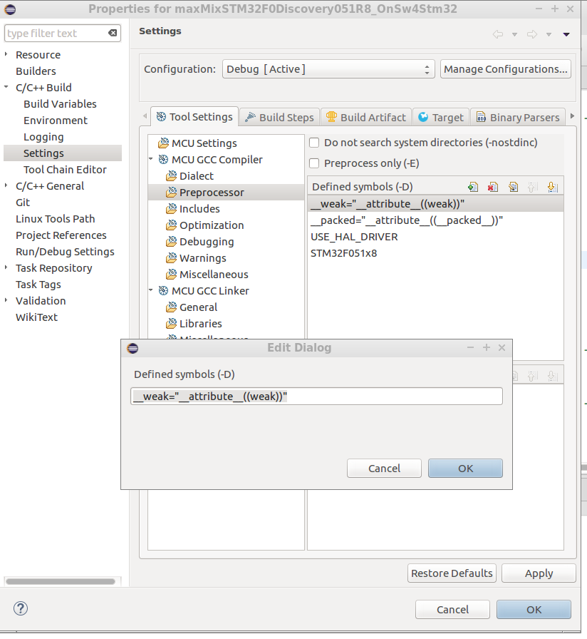 arm-none-eabi-gcc -mcpu=cortex-m0 -mthumb -mfloat-abi=soft -Dweak=attributeweak -Dpacked=attributepacked -DUSE_HAL_DRIVER -DSTM32F051x8 -IInc -IDrivers/STM32F0xx_HAL_Driver/Inc -IDrivers/STM32F0xx_HAL_Driver/Inc/Legacy -IDrivers/CMSIS/Include -IDrivers/CMSIS/Device/ST/STM32F0xx/Include -Os -g3 -Wall -fmessage-length=0 -ffunction-sections -c -fmessage-length=0 -MMD -MP -MF”Drivers/STM32F0xx_HAL_Driver/stm32f0xx_hal.d” -MT”Drivers/STM32F0xx_HAL_Driver/stm32f0xx_hal.o” -o “Drivers/STM32F0xx_HAL_Driver/stm32f0xx_hal.o” “/home/uli/ARMtoolchain/newWS/STM32Tracker/Drivers/STM32F0xx_HAL_Driver/Src/stm32f0xx_hal.c”