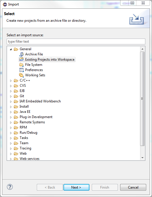 - In the import dialog (Select page) select the item General > Existing Project into Workspace and click the Next button
