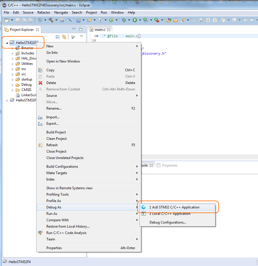 - Select the Debug As > 1 Ac6 STM32 C/C++ Application command