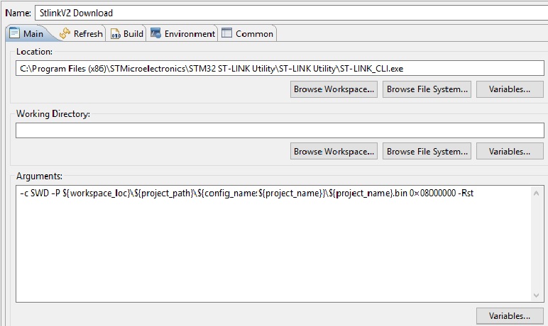 I cant download compiled binary file to stm32 without Error using “External Tools Configurations -> Program” interface.