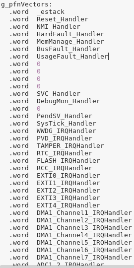 On these startup code, it contains vector table that contains all interrupt handler including pheriph`s interrupts. (Attatched screenshot at IRQs.png)