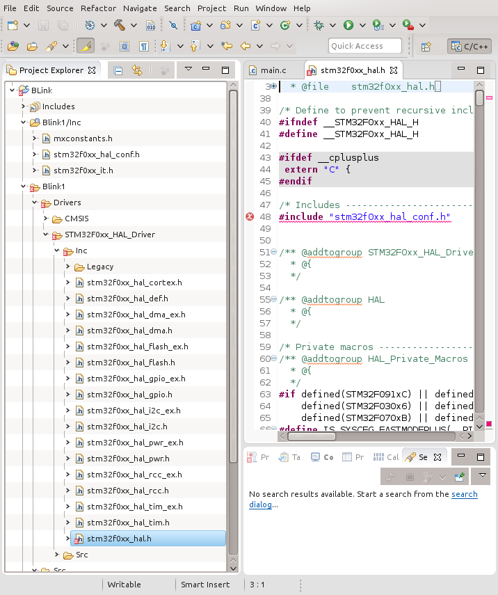 Next step, I created a new project, which should include i2c. Same problems as above, a lot of unresolved symbols. I added include statement after include statement in my “main.c”. With every include some errors disappeared, but never all. I tried to follow the include chain, which starts with #include “stm32f0xx_hal.h”. I added a symbol, macro or what ever to this header file project//Drivers/STM32F0xx_HAL_Driver/Inc/stm32f0xx_hal.h The compiler complained, that this symbol is not defined. I renamed this header file, no complains about a not existing file. I found 5 files with this name in my workspace. The one that really counts was /nucleo-f091rc_hal_lib/HAL_Driver/Inc/stm32f0xx_hal.h