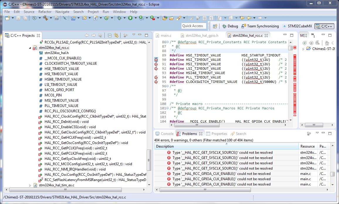 Trying to program a simple GPIO application on a Nucleo 64 STM32L476 board. During build I get 83 errors, all having to do with HAL_RCC commands that are “not resolved”. Please see attached view of Eclipse IDE.
