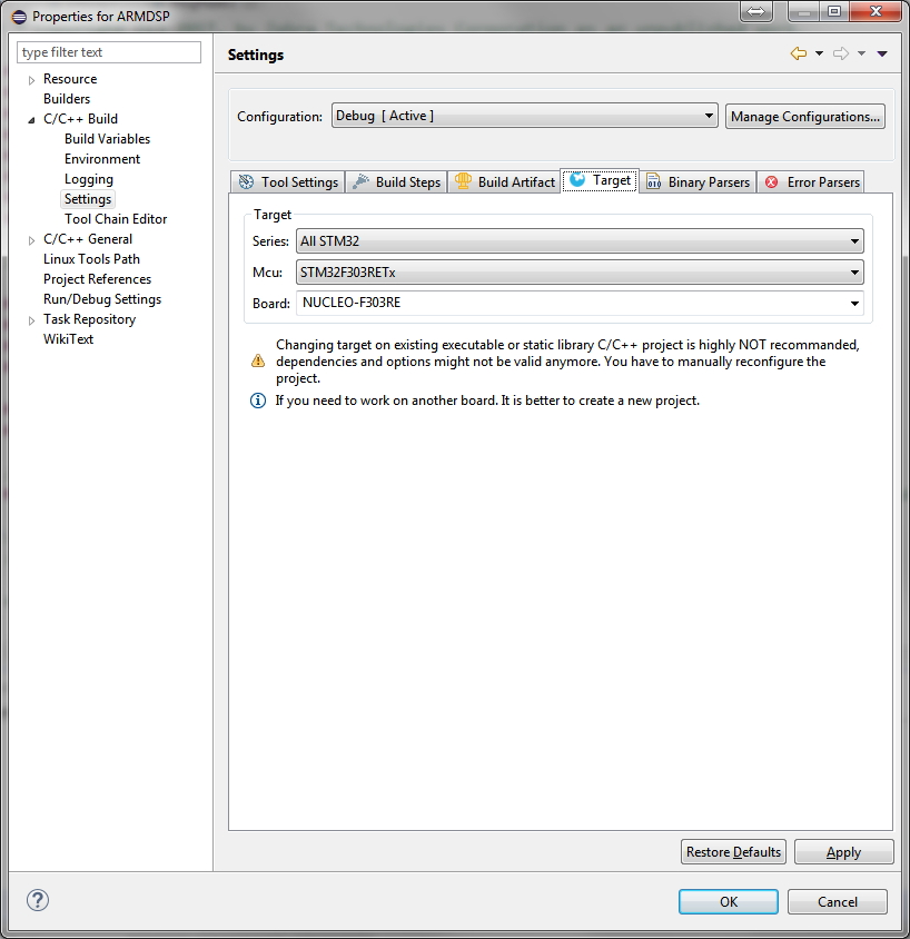 I realize that one normally selects the target MCU when a project is first created. This works without issue. I am also aware of the potential risks in changing the Target setting on a pre-existing project. However, there are cases where I need to be able to change the target MCU after a project is created. One example of this is a project that shares a common code base targeted to multiple hardware platforms. I am working on several projects that fall into this category. I make use of Eclipse’s multiple “Build Configuration” feature to set target-specific global defines, file paths, compiler, link and other build options - including the target MCU.