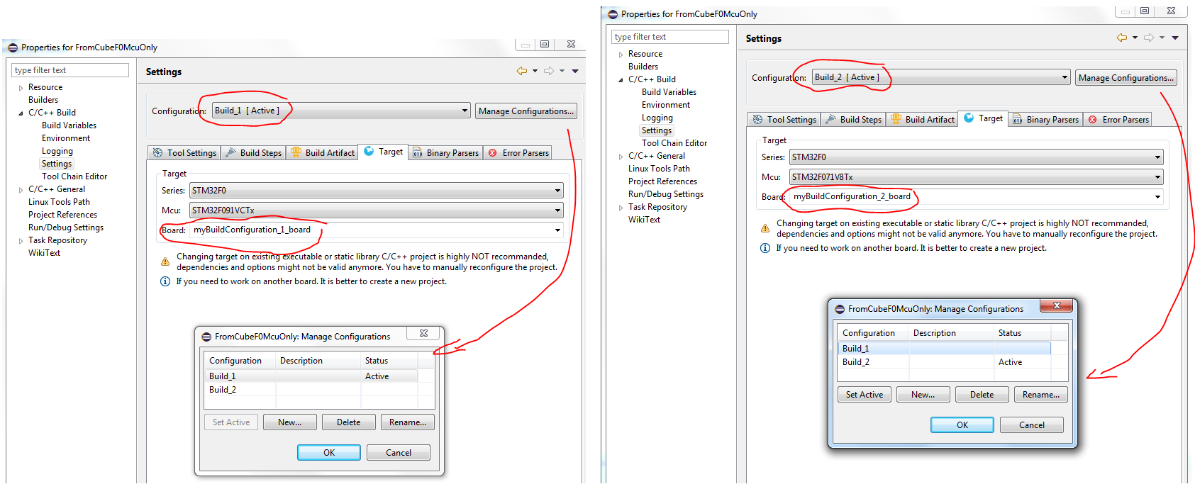 My first guess is you should be able to proceed the way you want if updating target MCU you’re setting a board name too (even a dummy one but not empty one ! ). Sounds to me Apply / Ok is only considering target update if some board material (back even dummy one) is specified.
