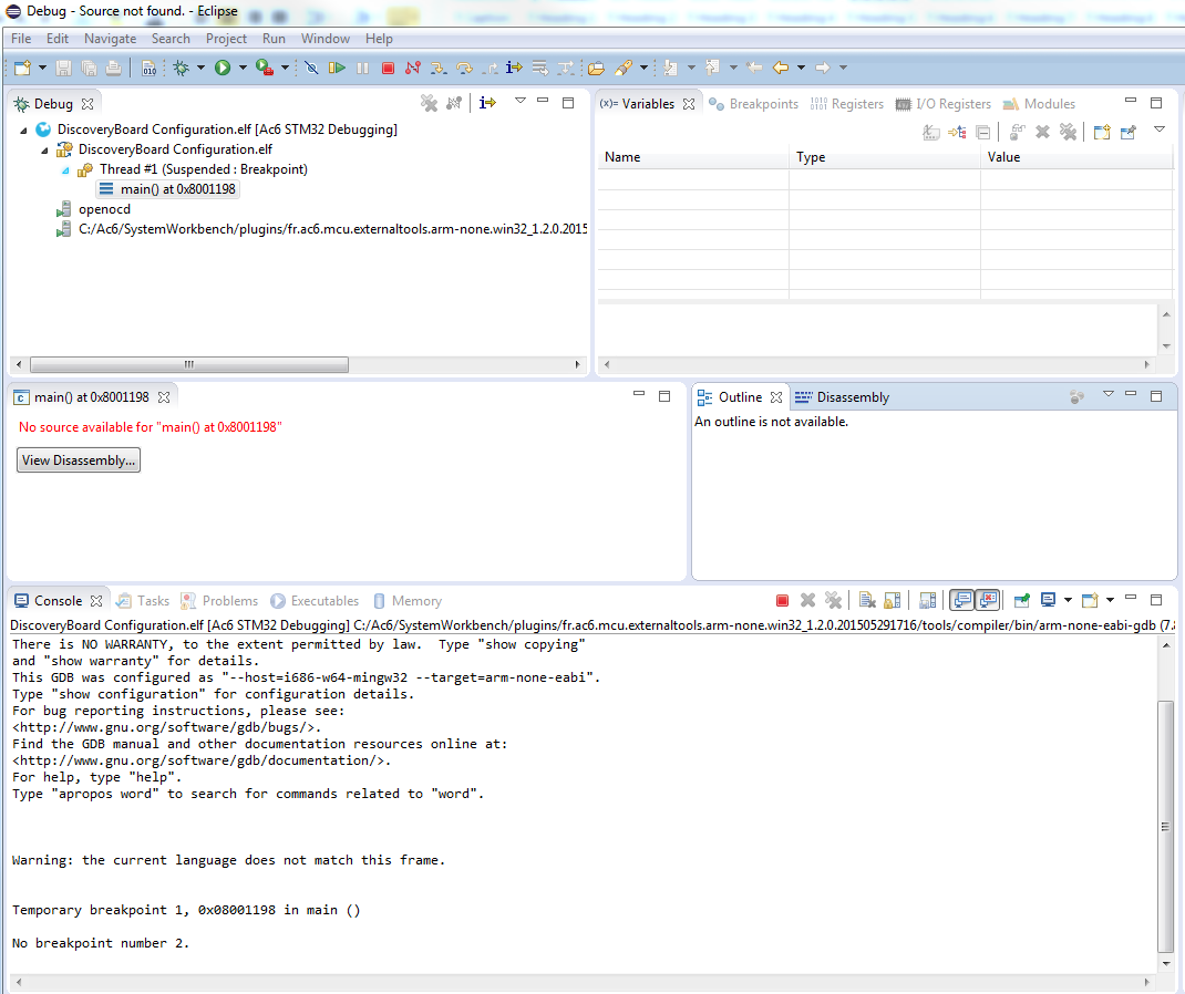 I installed System Workbench, and used CubeMX to generate a STM32F4 Discovery base project. I got it to import and compile properly, and when I go to debug, I have a problem where it tells me there is “no source available for main() at 0x8001198” - I get no breakpoint capability - I have attached a screenshot - Does anyone have any ideas? Thanks