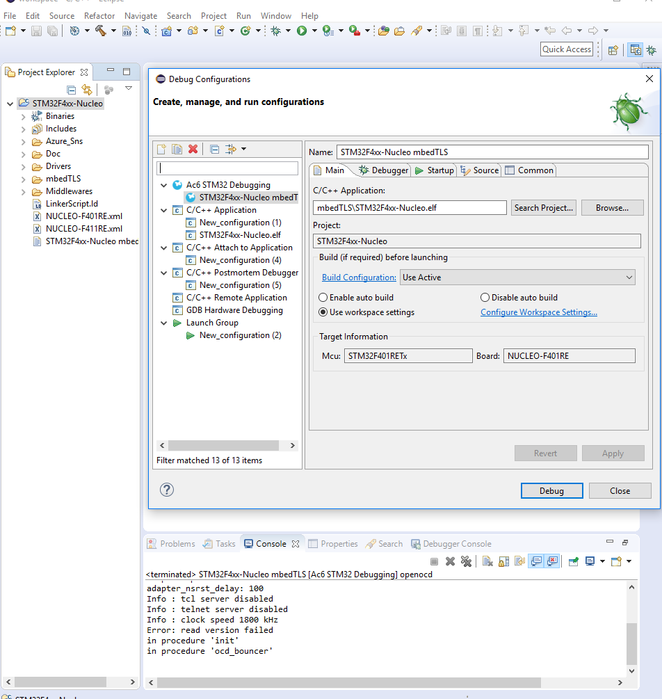 I’m new in System Workbench AC6. My Problem is that I would to debug the standard project that I found in the “en.fp-cld-azure1” folder but I can’t do it. the only difference respect to the default pack is that I’m using NUCLEO-F411RE instead of NUCLEO-F401RE (Increase only the size of the RAM).The RUN mode works correctly but the Debug mode it doesn’t work. I changed the MCU and Board to use my NUCLEO in Properties->C/C++ Build->Setting->Apply, I rebuild the project, but when I go into Debug Configuration The Target Information doesn’t change. If I try anyway to debugI have the following error that I attached. I don’t what is the problem, I hope someone could help me! Thanks in advance.
