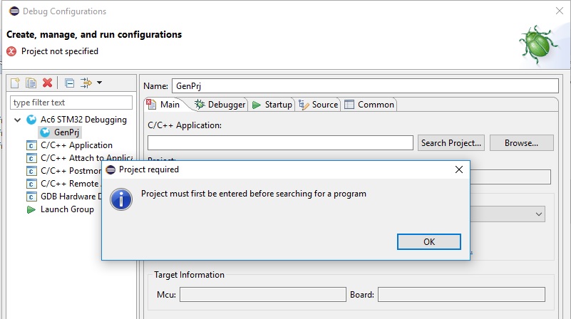 Now though, after creating the new project with the good files, it compiles and runs fine but I can’t create debug/run configurations