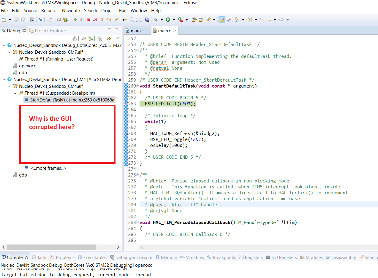 I can run and debug code on both the M4 and M7 core fine. However, after adding FreeRTOS (CMSIS v1) to the M4 core project using STM32CubeMX, I cannot step through the StartDefaultTask(). I can step through main() up until the task is created. After the first breakpoint is hit within the task, the debugger locks up and I cannot do anything. Also the Eclipse Debug tab “breaks” when this happens (See screenshot).