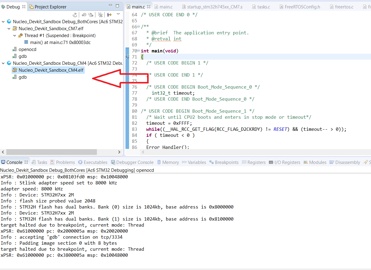 The project now builds and the debugger starts without errors, but only the M7 core debugger starts. The M4 core debugger does not start.
