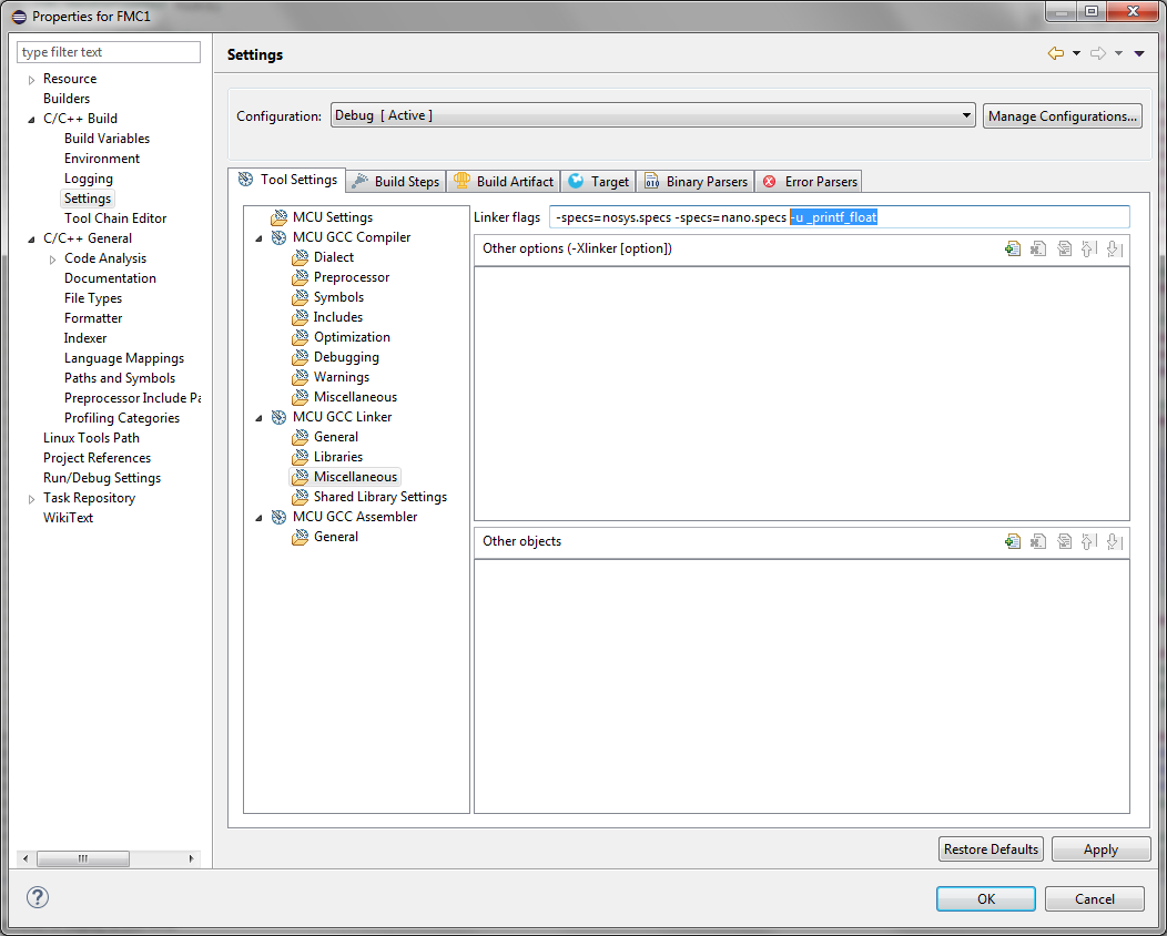 By default the float support is disabled. To enable it, add the linker flag: “-u _printf_float” in your project properties:
